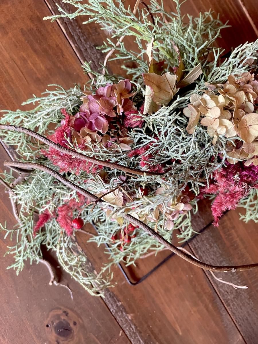(花材:コニファーブルーアイス、ケイトウ、野バラの実など