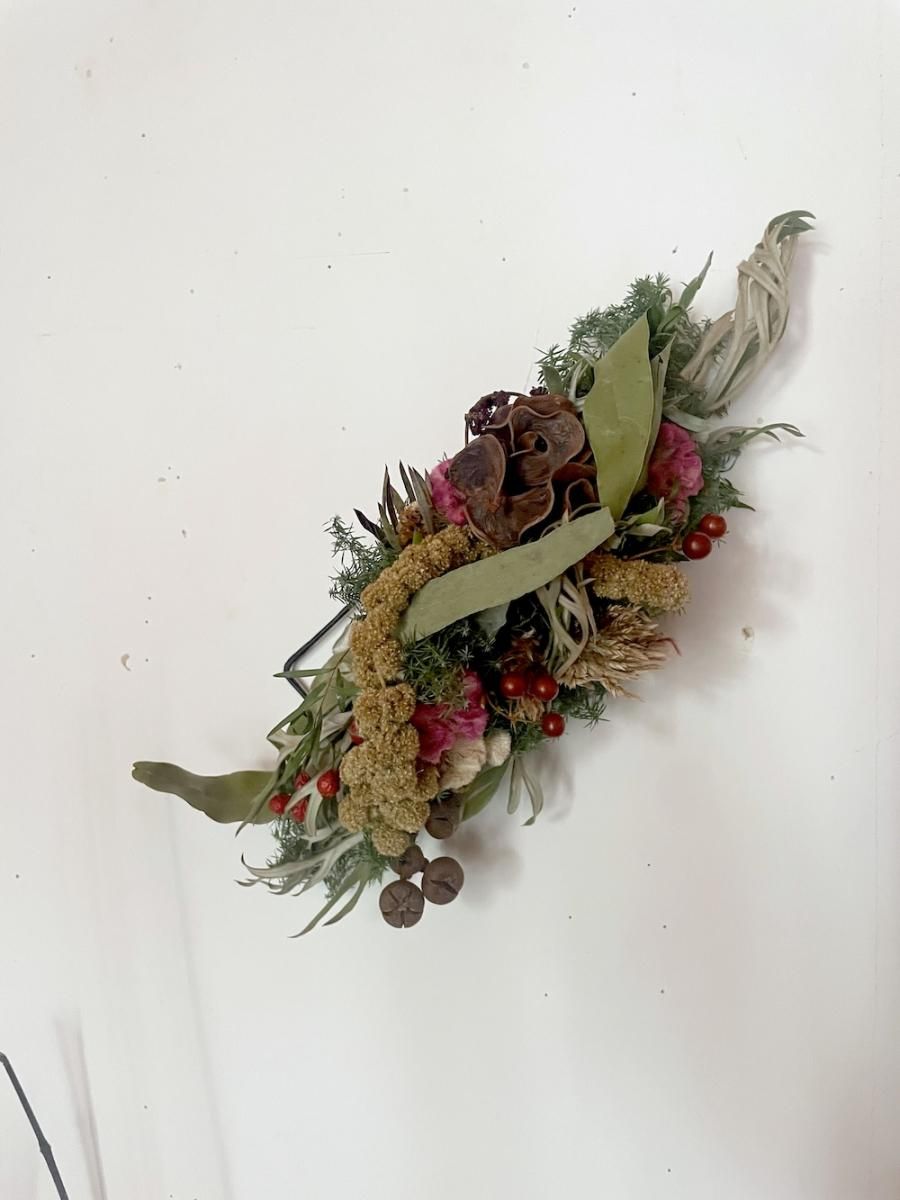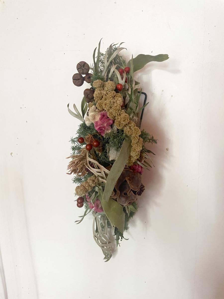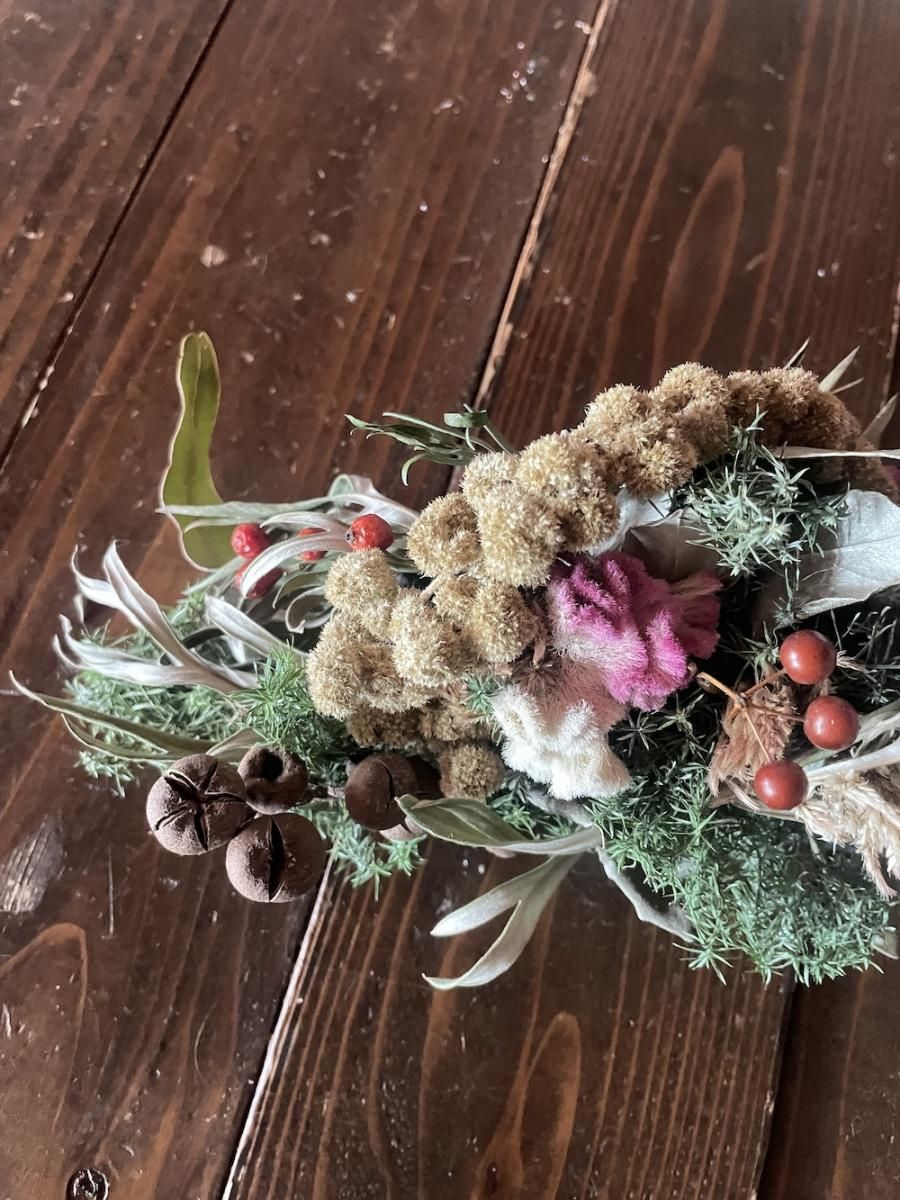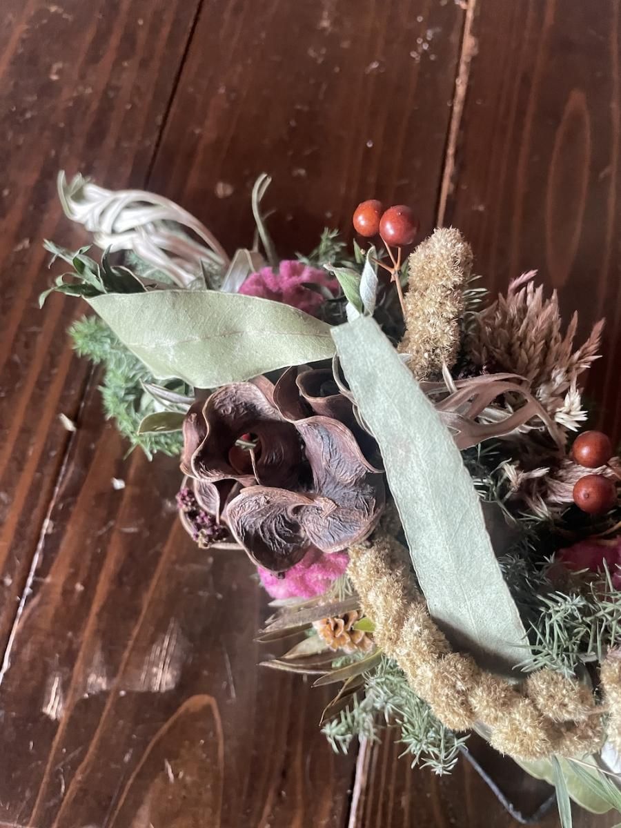 置く環境により同じ花材でも変化がそれぞれ異なり同じものが2つとないものになります。暮らしの中で自然のままにゆっくりと時間をかけて乾燥して、色や形の変化をたのしんでいただけたらと思います。日々、暮らしの中にある小さな事もしあわせだと思える事へと繋がりますように…